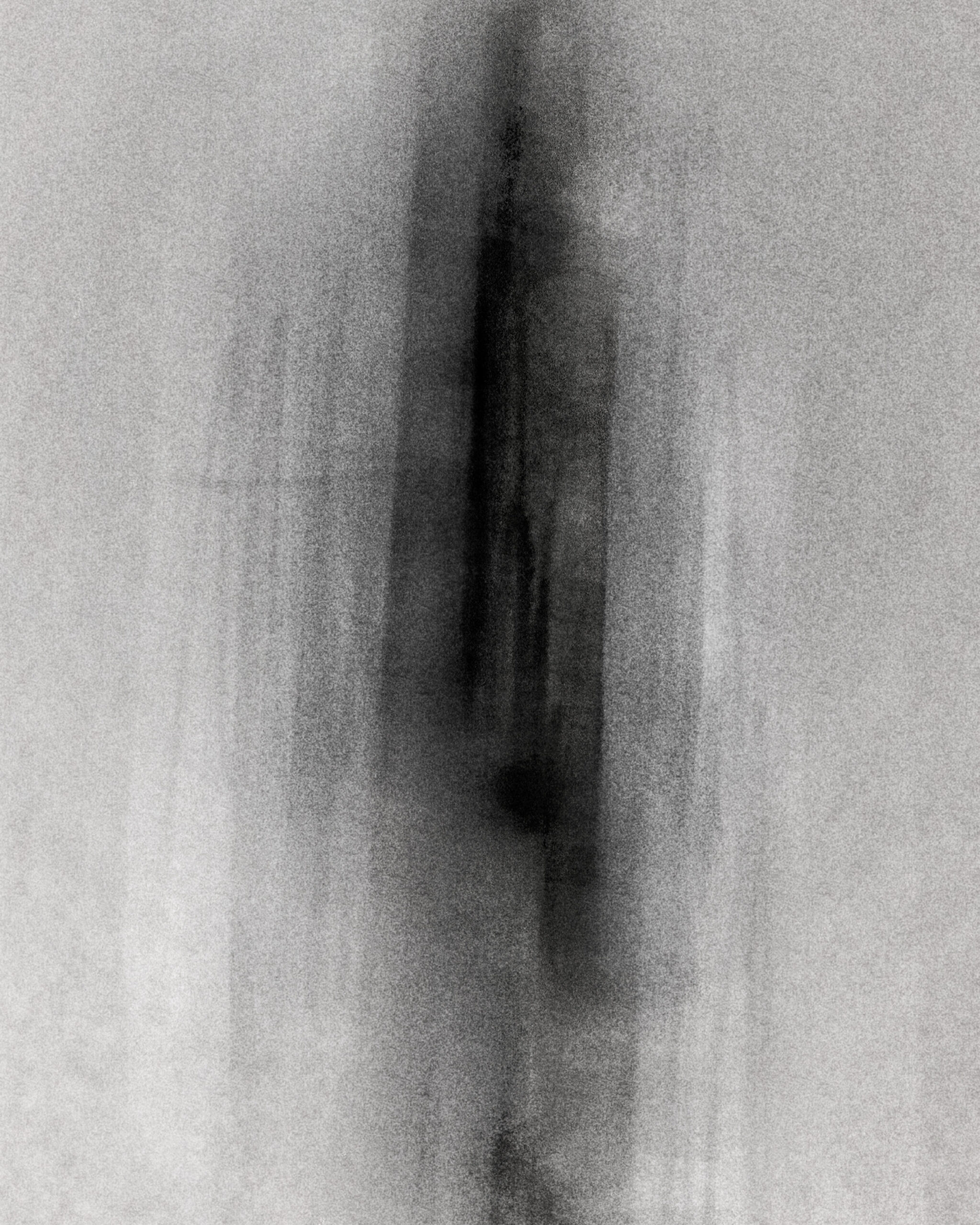 The work is presented in grayscale, rich in grain and subtle light shifts. Its softness contrasts with the vertical crack that anchors the composition. That crack may suggest erosion, vibration, compression, or resonance—but it remains open to interpretation. The work is not declarative; it invites stillness, and perhaps a perceptual pause.